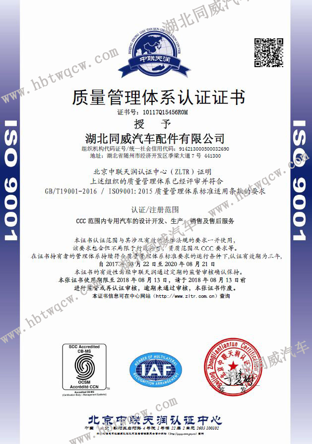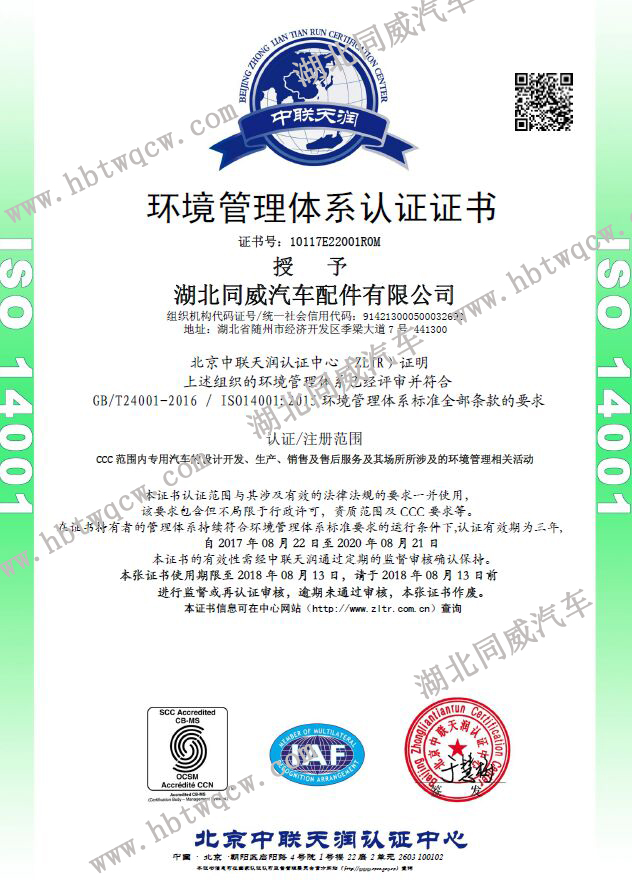 湖北同威汽車配件有限公司通過9001管理體系認證,其中包括職業(yè)健康安全管理體系認證證書,質(zhì)量體系管理認證證書,環(huán)境管理體系認證證書。